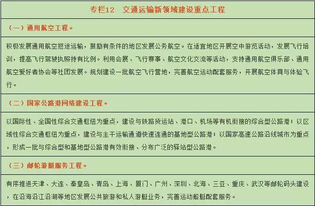 机场:新增通用机场200个,新增民用运输机场53个,基本覆盖20万以上人口城市。